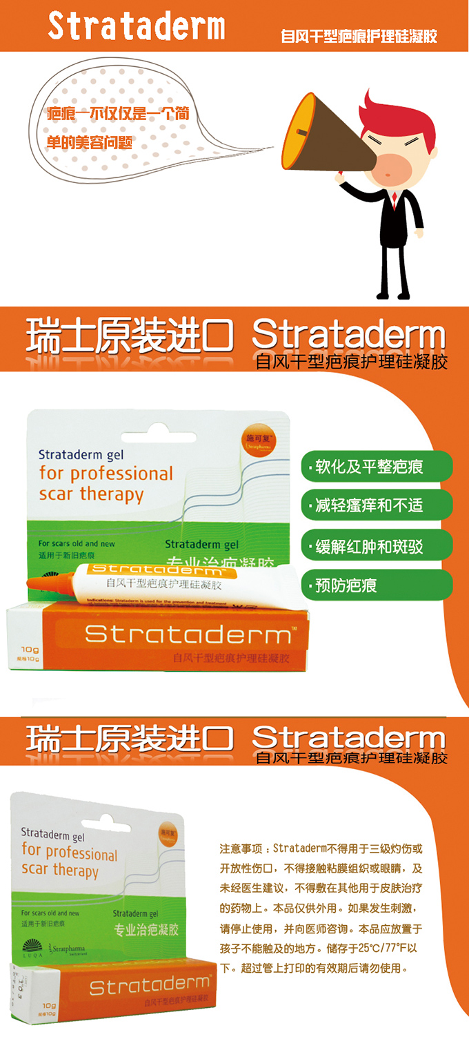 在使用前让疤痕部位清洁干燥。 将Strataderm®非常薄地涂抹在疤痕表面并且让其干燥。每日一次,暴露部位每日两次,或遵医嘱。为达到最好效果,需保证Strataderm®连续接触皮肤(24小时/天);Strataderm® 被推荐至少连续使用60-90天。大面积及陈旧疤痕需使用更长时间。连续使用直至疤痕部位再无明显改进。